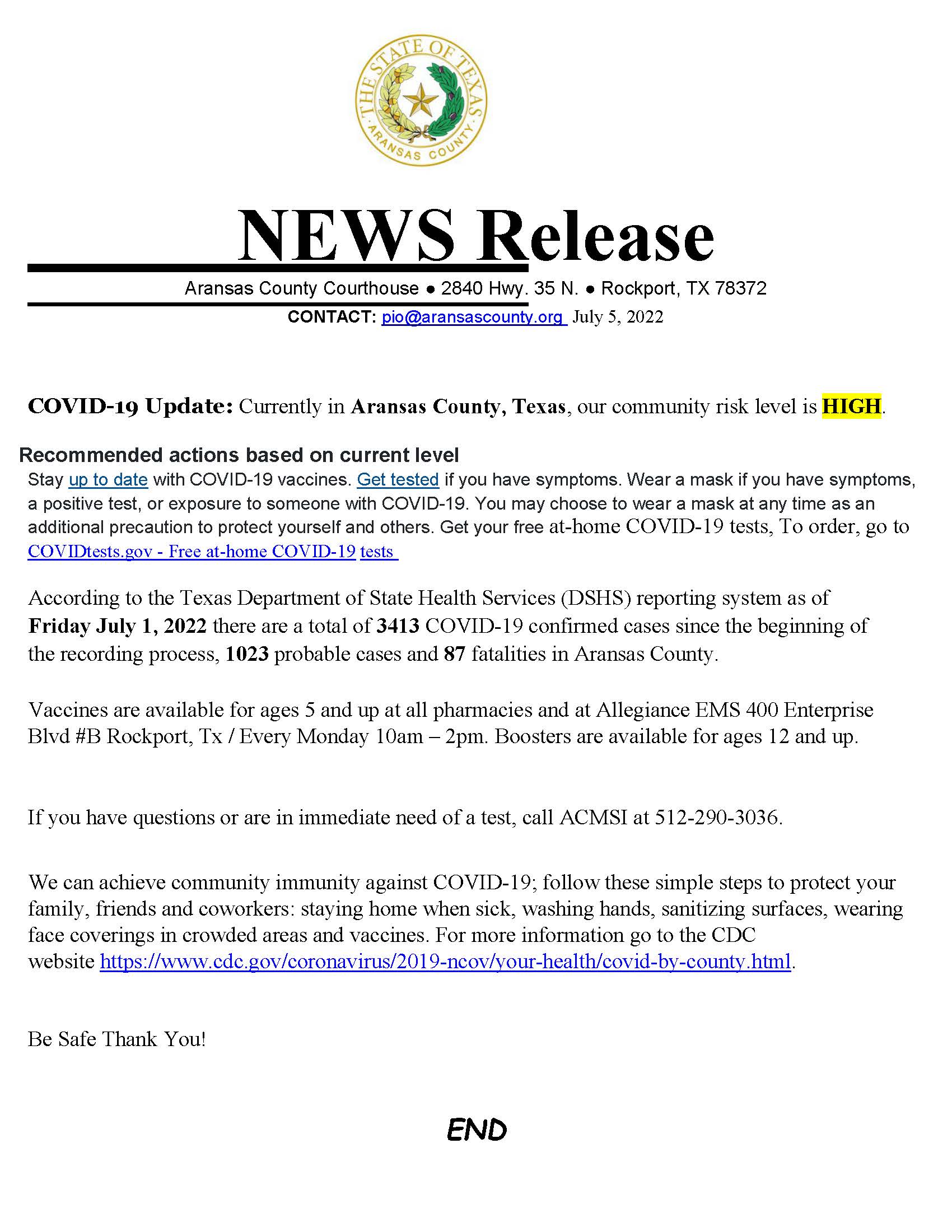 According to the Texas Department of State Health Services (DSHS) reporting system as of Friday July 1, 2022 there are a total of 3413 COVID-19 confirmed cases since the beginning of the recording process, 1023 probable cases and 87 fatalities in Aransas County.