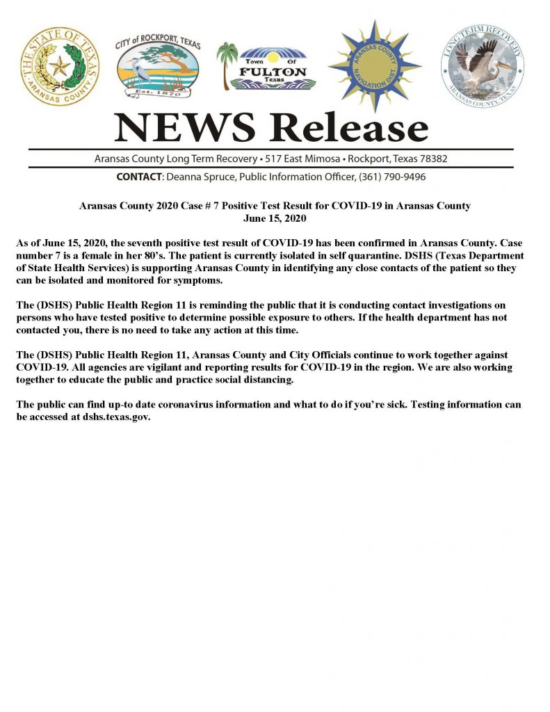 Aransas County 2020 Case #7 Positive Test Result COVID-19