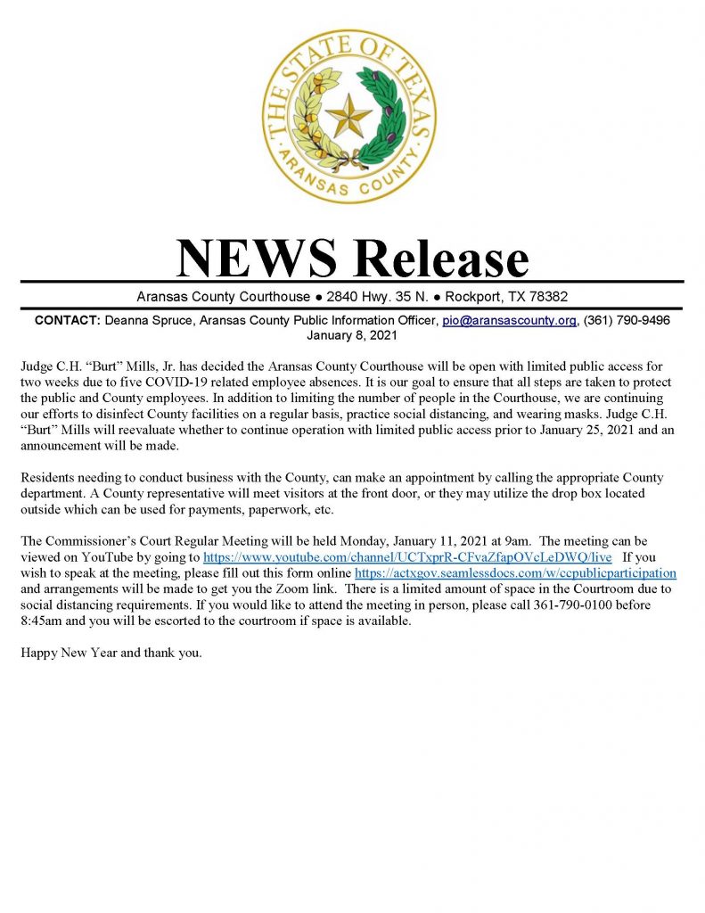 Aransas County Courthouse will continue with limited access to the public due to COVID-19 related employee absences.