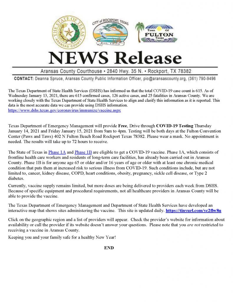 Aransas County COVID-19 Update Free Testing starts tomorrow