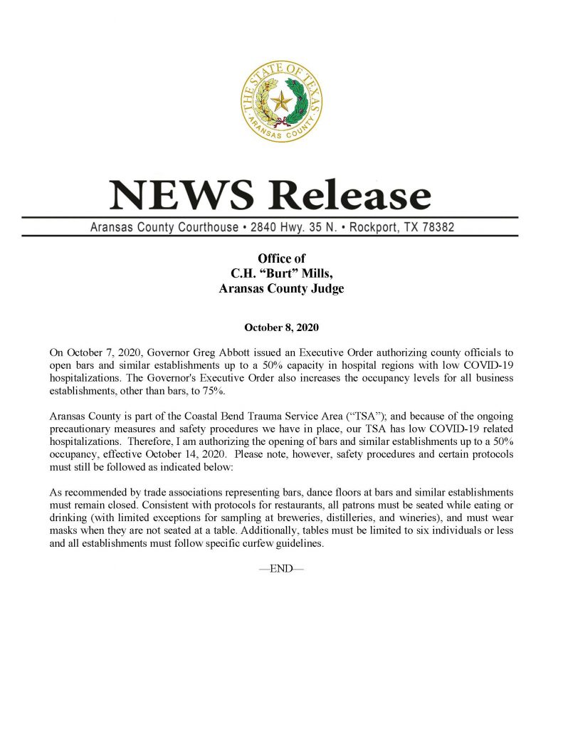 Aransas County opens bars and similar establishments up to a 50% occupancy effective October 14, 2020