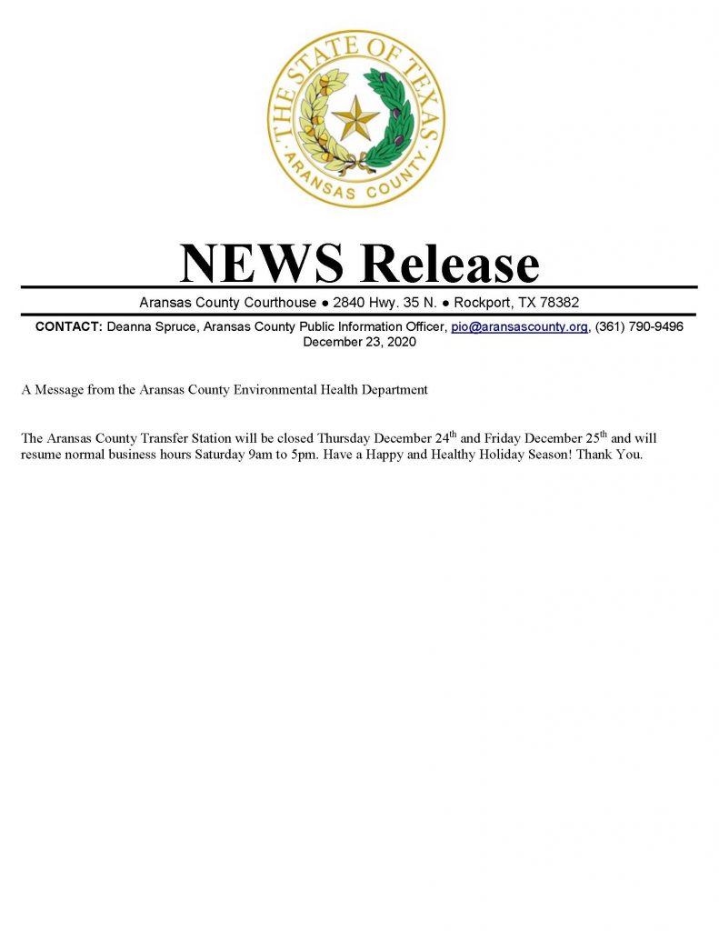 Aransas County Transfer Station Closed Dec. 24-25, 2020