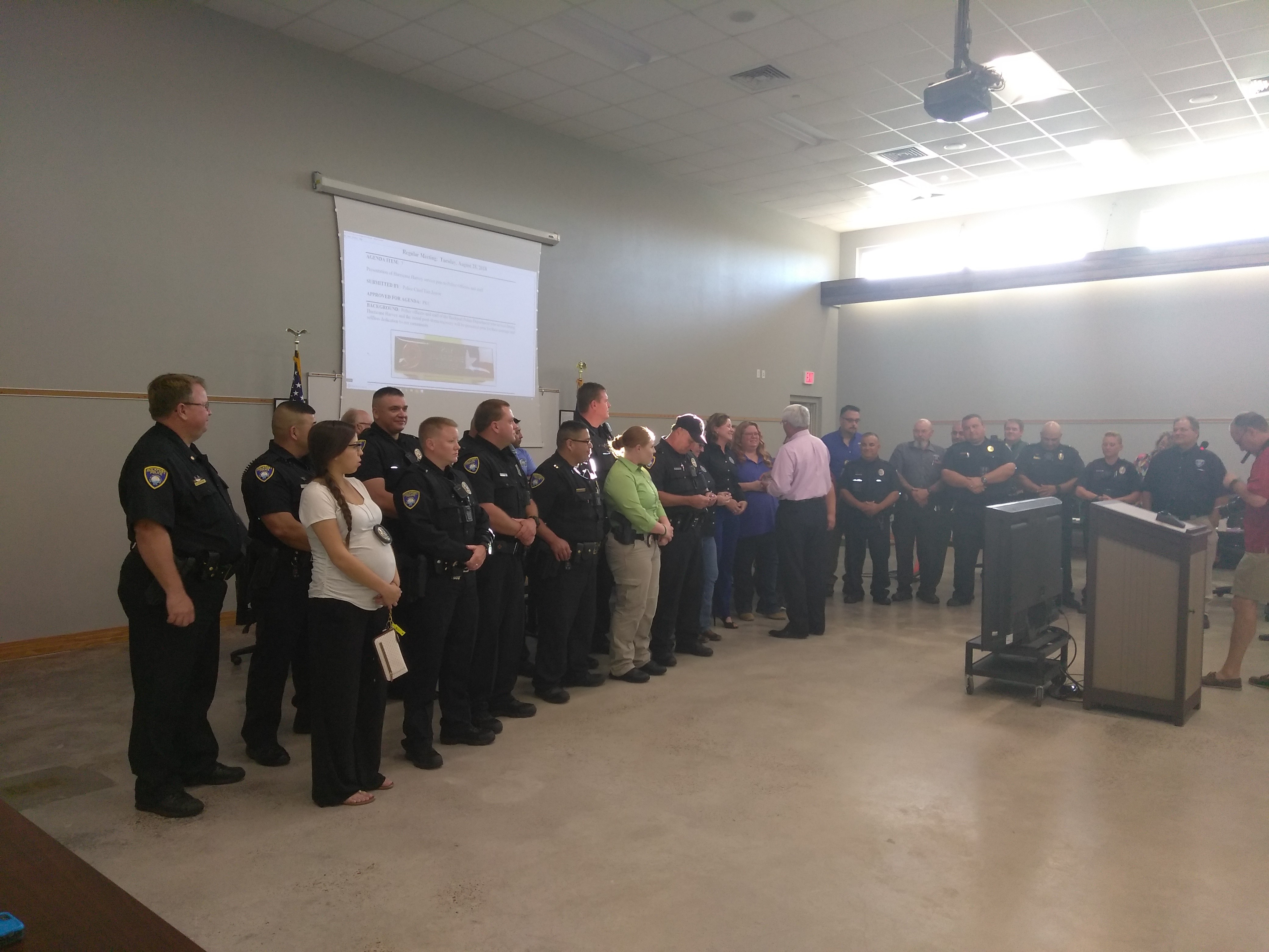 Chief Jayroe and Mayor Rios presenting first responders a Hurricane Harvey lapel pin for staying and working around the clock during the disaster