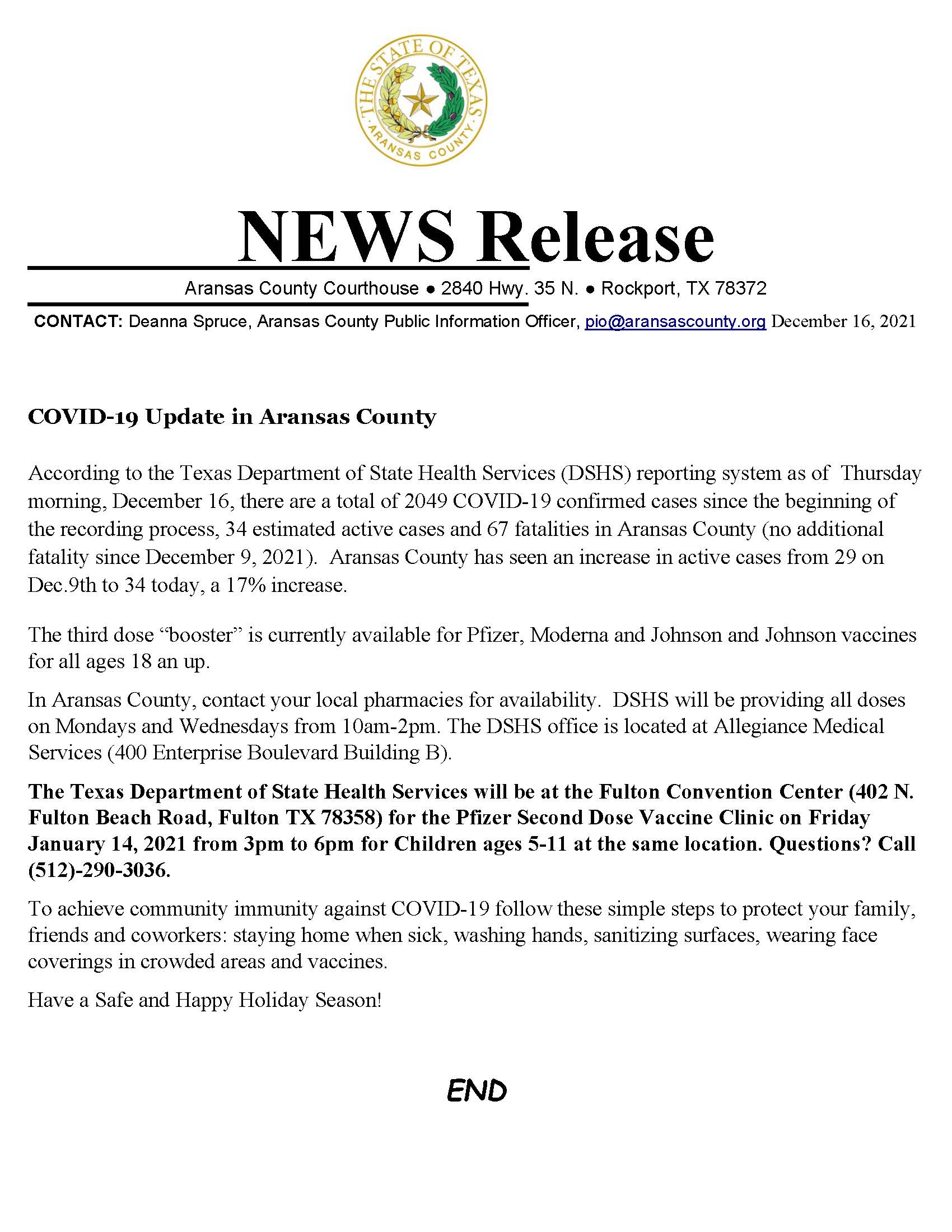 COVID-19 Aransas County Number Update and Pediatric Second Dose Vaccine Jan 14