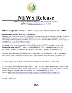 COVID-19 Update: Currently in Aransas County, Texas, our community risk level is LOW.