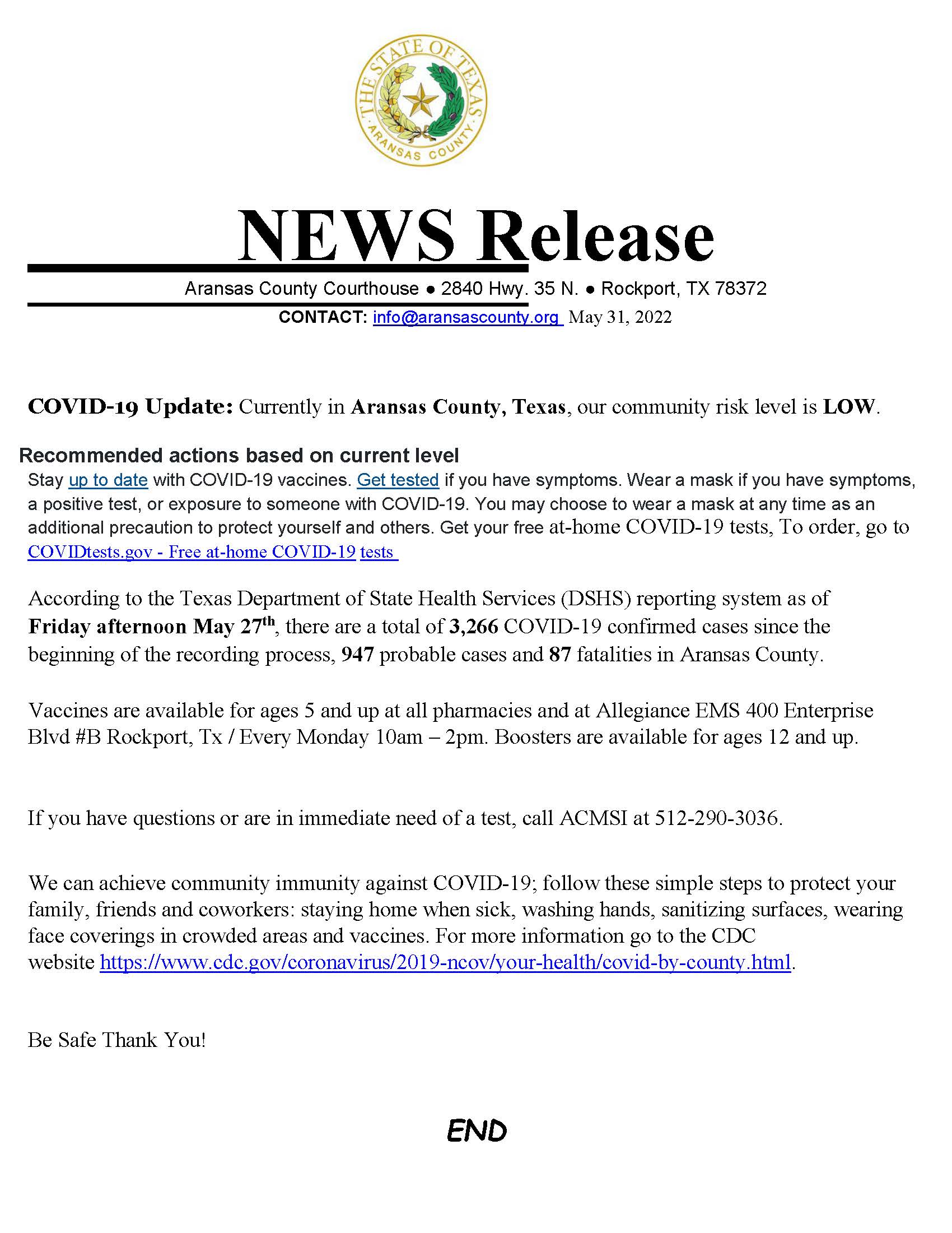 According to the Texas Department of State Health Services (DSHS) reporting system as of Friday afternoon May 27th, there are a total of 3,266 COVID-19 confirmed cases since the beginning of the recording process, 947 probable cases and 87 fatalities in Aransas County.