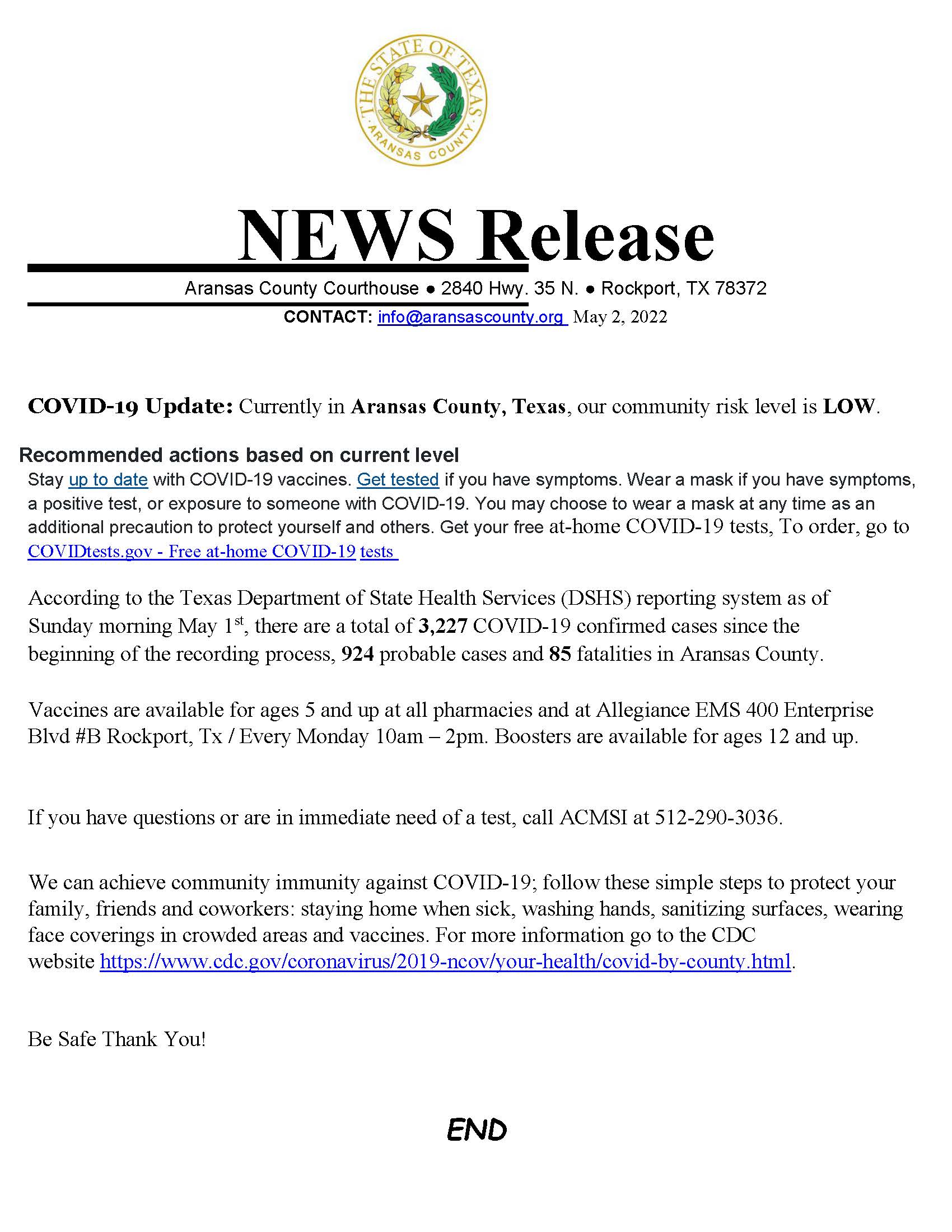 COVID-19 Update: Currently in Aransas County, Texas, our community risk level is LOW.