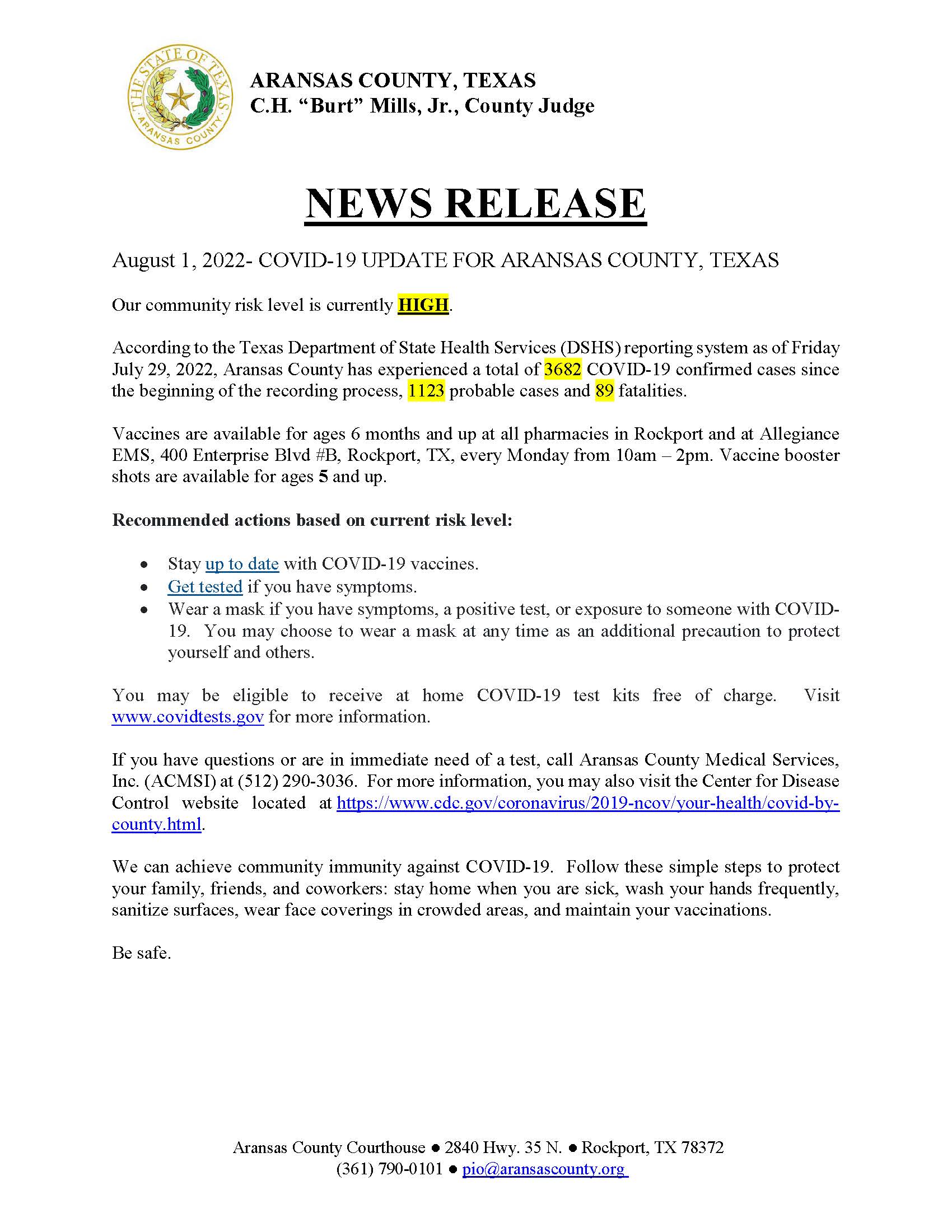 August 1, 2022- COVID-19 UPDATE FOR ARANSAS COUNTY, TEXAS