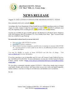 August 15, 2022- COVID-19 UPDATE FOR ARANSAS COUNTY, TEXAS
