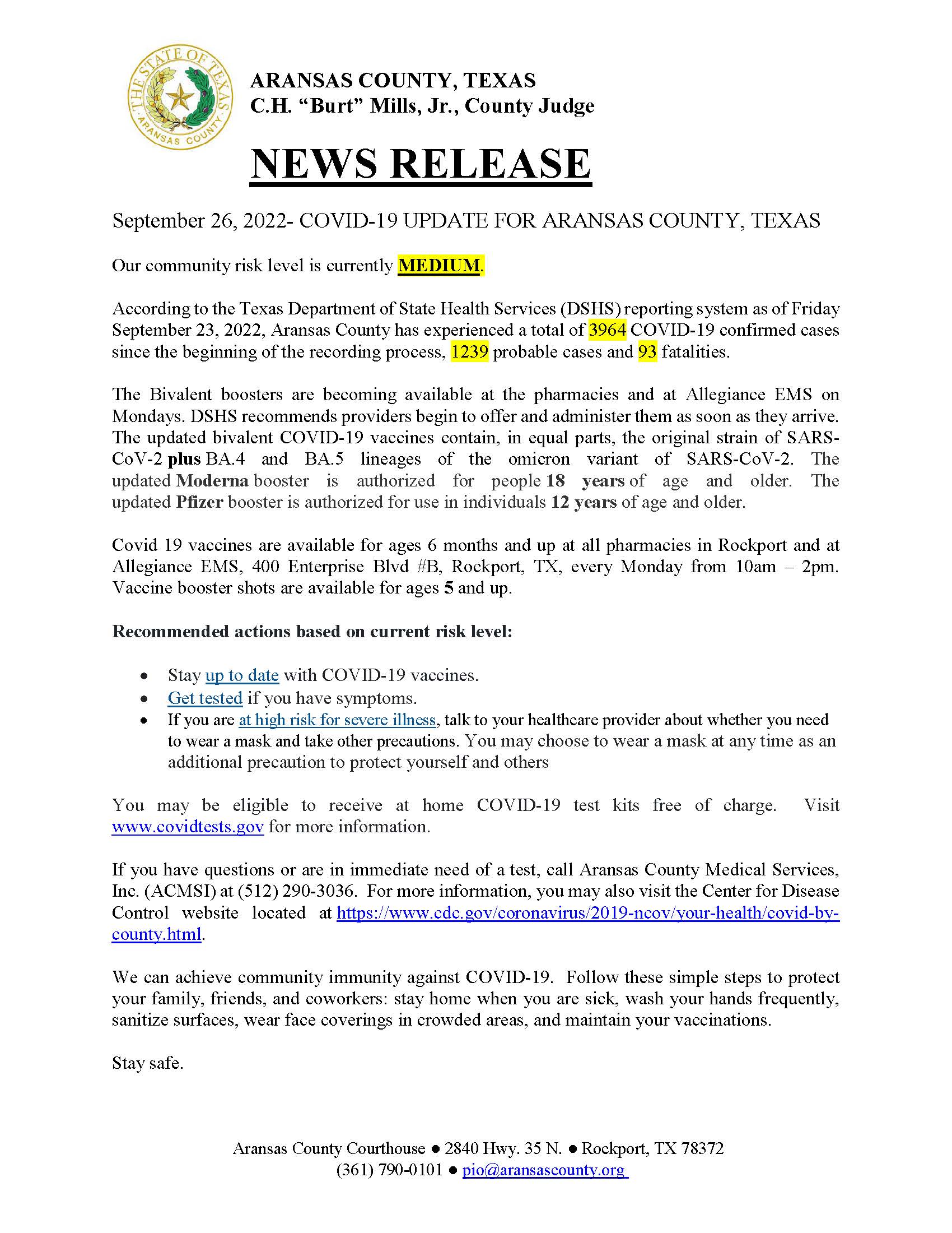 September 26, 2022- COVID-19 UPDATE FOR ARANSAS COUNTY, TEXAS