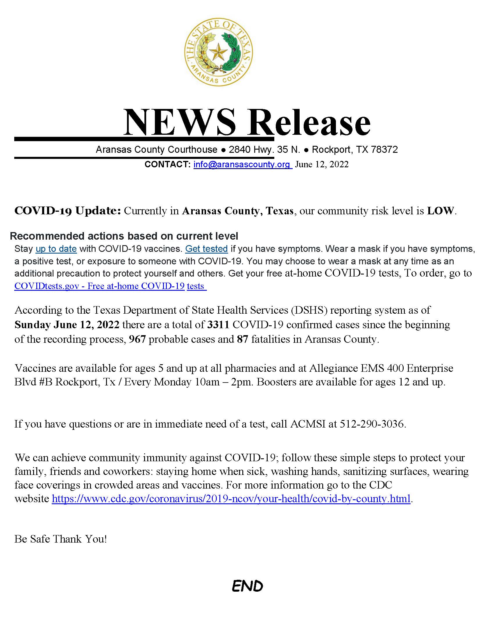 According to the Texas Department of State Health Services (DSHS) reporting system as of Sunday June 12, 2022 there are a total of 3311 COVID-19 confirmed cases since the beginning of the recording process, 967 probable cases and 87 fatalities in Aransas County.