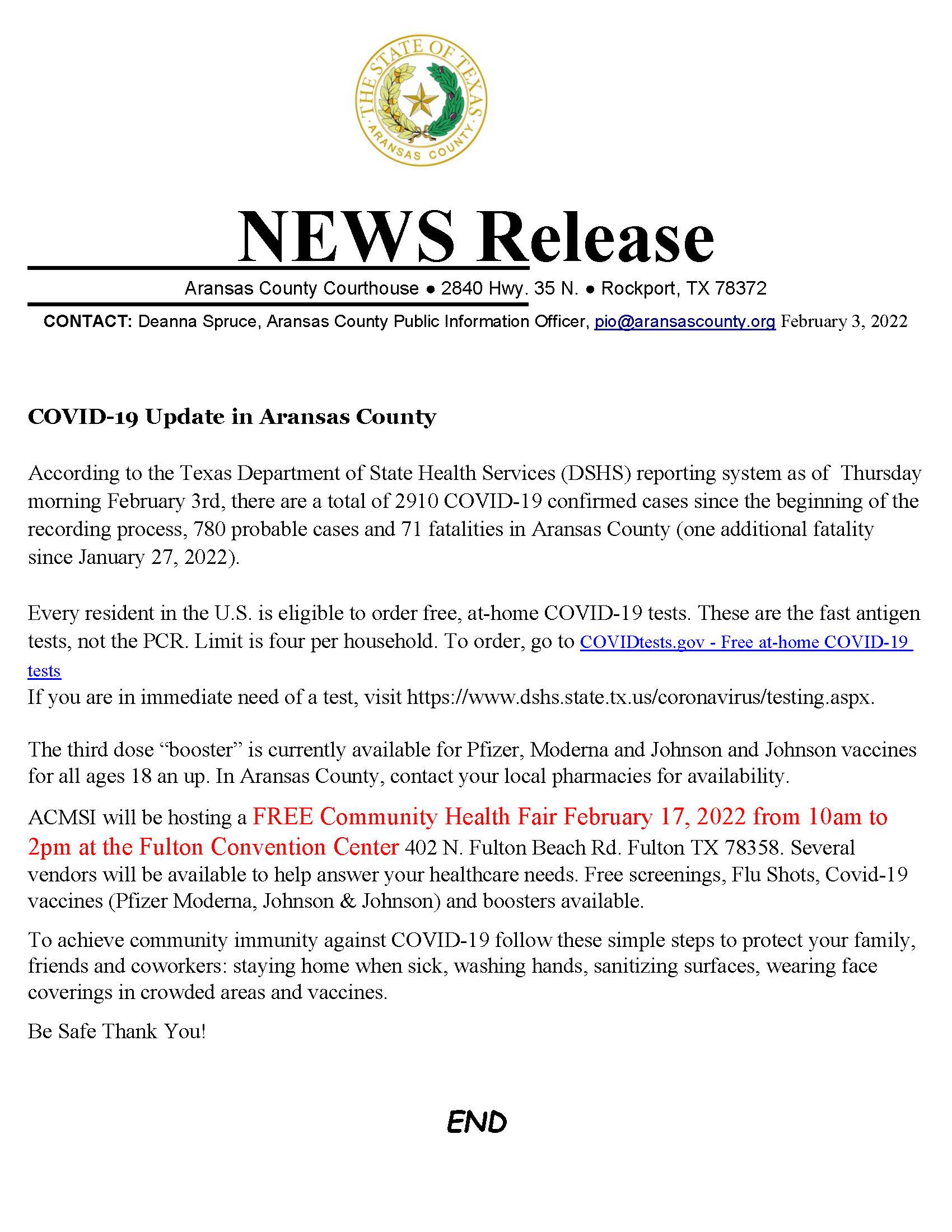 COVID-19 Update Aransas County and FREE Community Health Fair Feb.17,2022 10am-2pm at the Fulton Convention Center