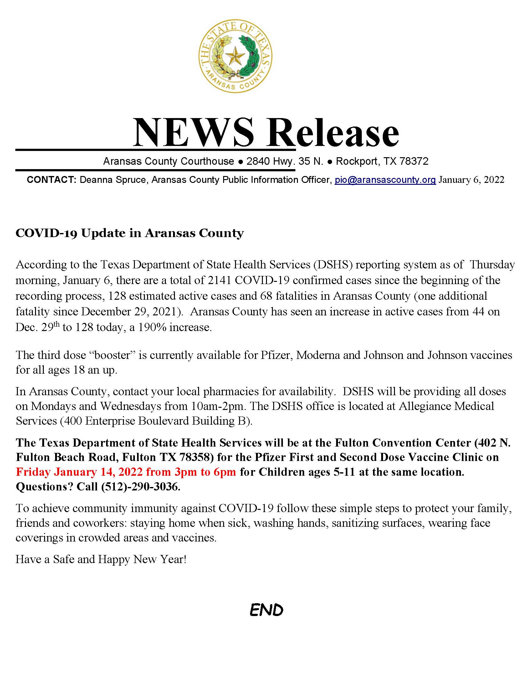 COVID-19 Update in Aransas County and Pediatric Vaccine Clinic Jan. 14, 2022