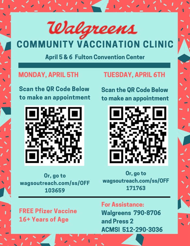 Walgreen Community Vaccination Clinic April 5 and 6 Fulton Convention Center